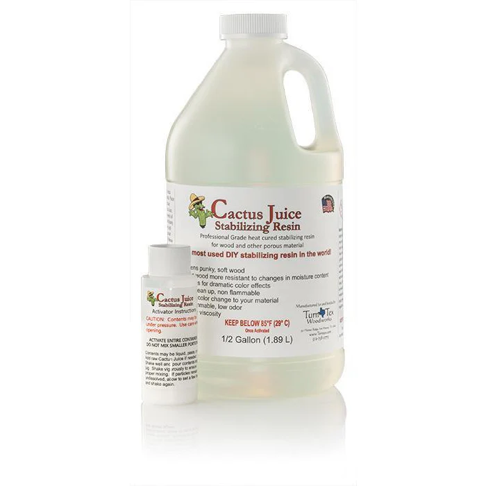 Cactus Juice Stabilizing Resin is the original premium professional grade heat cured resin for stabilizing and hardening wood and other porous material. This makes the wood harder, and much more resistant to moisture. It is especially effective on those beautiful, punky, spalted woods that are just too soft to work with! Cactus Juice is easy to use and does not significantly change the color of most woods. It is NOT solvent-based and cures 99.99% from liquid to solid by weight, far superior to typical home stabilizing solutions such as Minwax Wood Hardener or polyurethane. Stop throwing away those punky blanks and give Cactus Juice a try!
